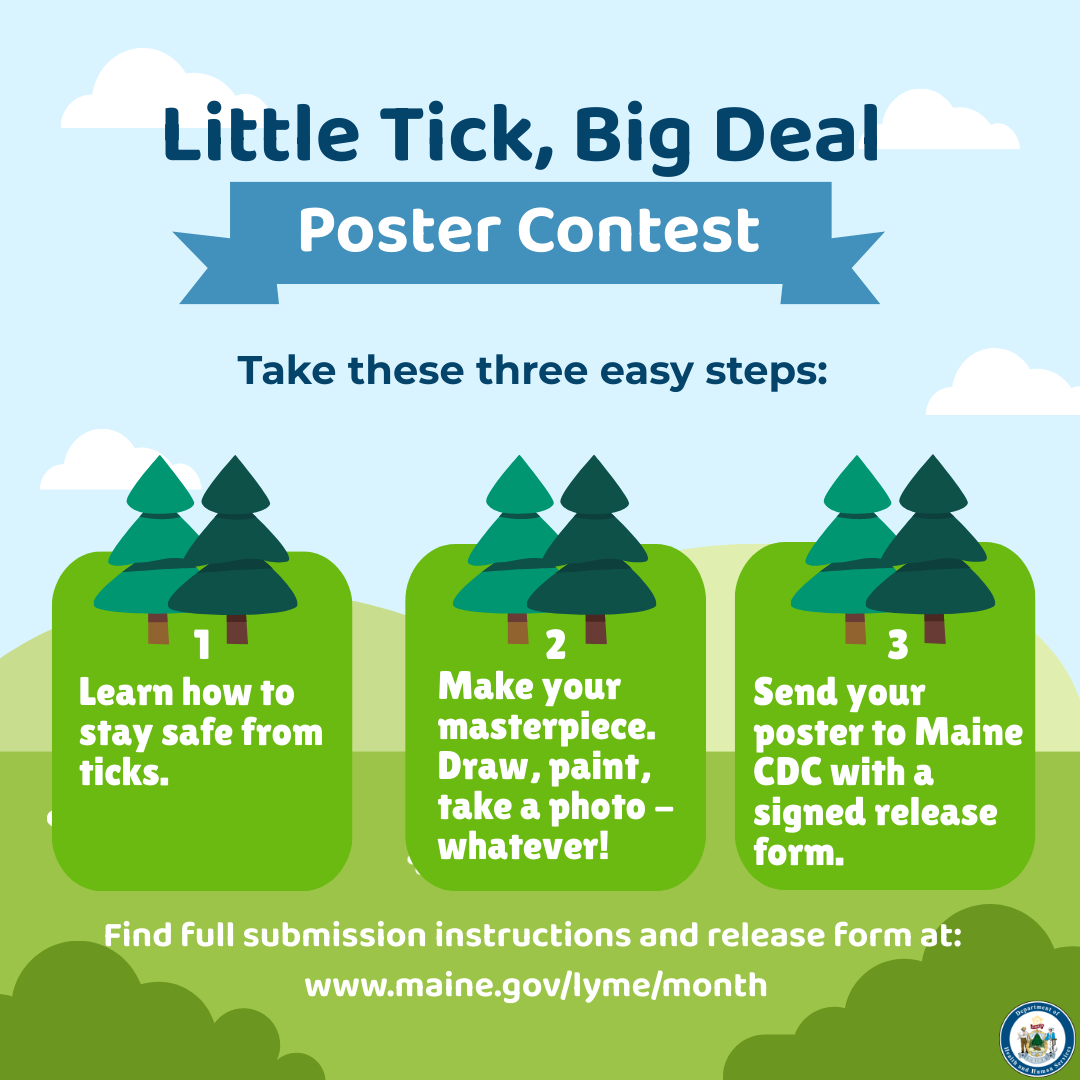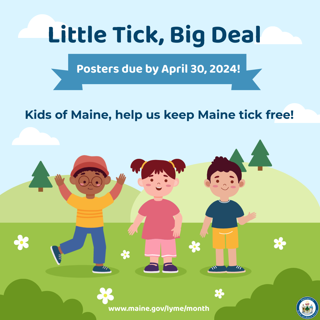 Do you know or work with Maine youth in Kindergarten through 8th grade? Maine CDC is running the 2024 Lyme Disease Awareness Month poster contest NOW! The theme is “Little Tick, Big Deal.”