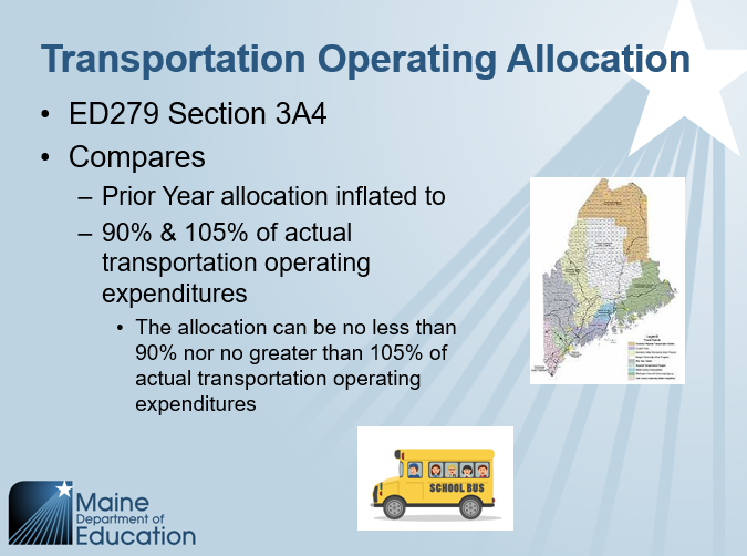 The transportation operating allocation is determined by comparing the prior year allocation to the most recent actual expenditure data submitted by each SAU in the MEFS financial system.