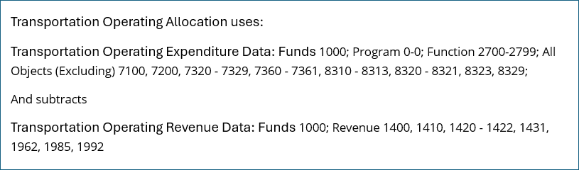 The transportation allocation is determined in the following manner using the codes found in the Model Chart of Accounts: Transportation<https://www.maine.gov/doe/sites/maine.gov.doe/files/inline-files/School%20Finance%20-%20Model%20Chart%20of%20Accounts%20Transportation%20-%209.13.2018%20.xlsx>